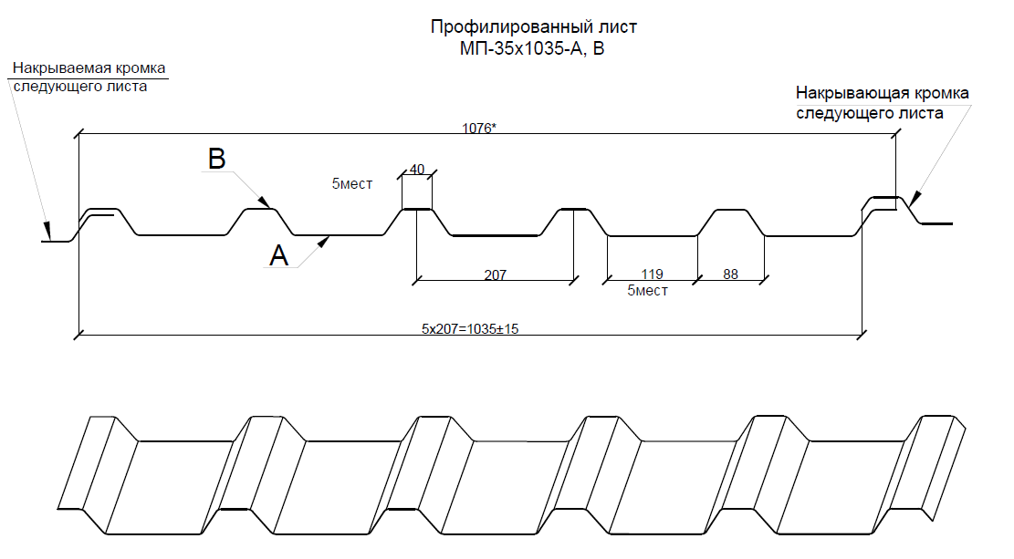 Профнастил Металл Профиль МП-35х1035-A,B обладает трапециевидной формой профиля с широкими ребрами жесткости (119 мм) и небольшим шагом (40 мм), высота профиля равна 35 мм. Такая геометрия профиля гарантирует ему усиленную стойкость к изгибу.