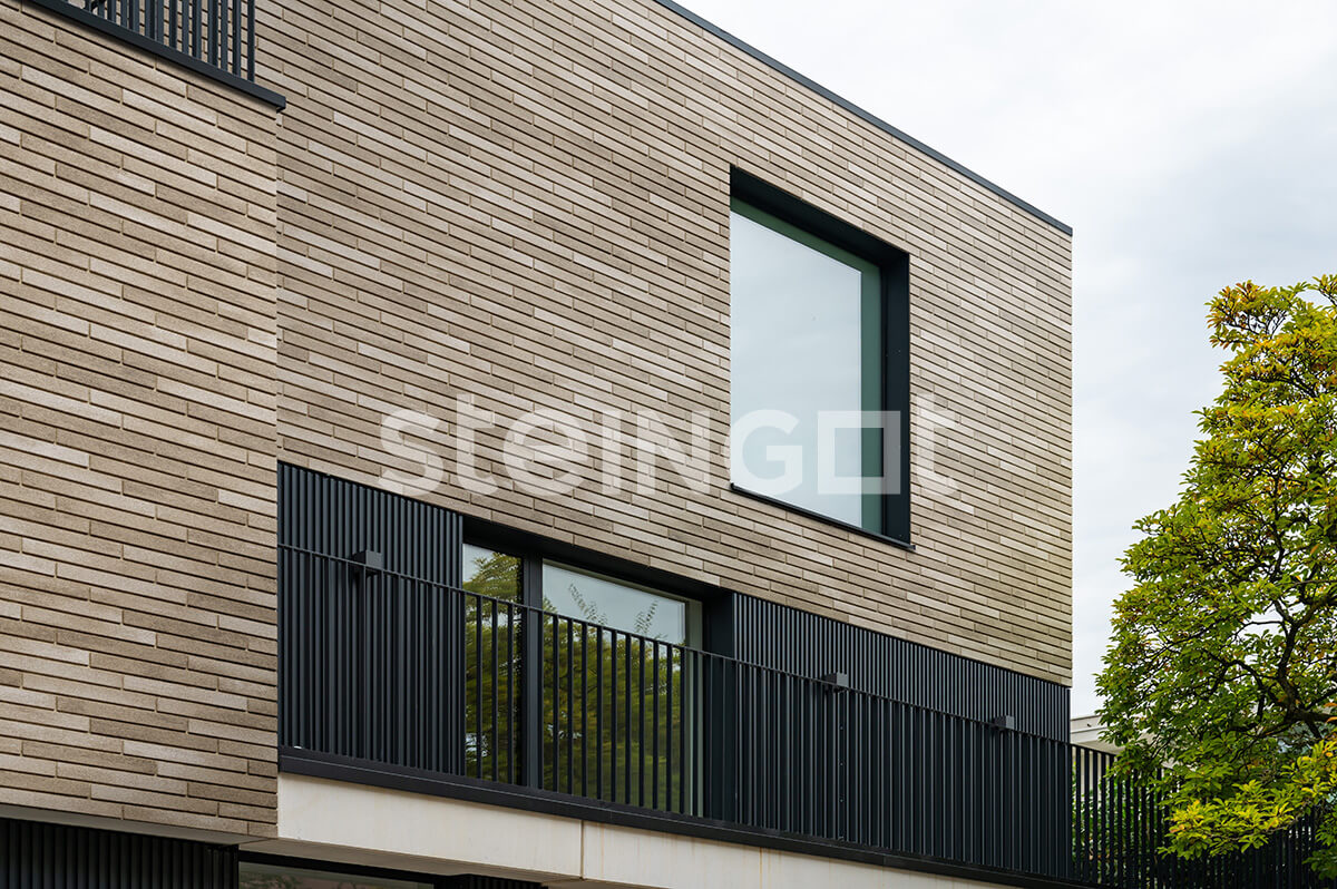 Ригельный вибропрессованный кирпич вытянутого формата 410×40×70 мм — современное решение для облицовки и архитектурных акцентов. Удлинённая геометрия ригельного кирпича создаёт выразительный ритм кладки и подчёркивает актуальный стиль фасадов. Отсутствие фаски обеспечивает ровную, цельную поверхность с чёткими линиями, а фактура придаёт облицовке лаконичную и премиальную эстетику.